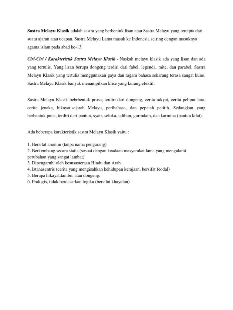 Contoh Sastra Melayu Klasik Pengertian Karakteristik Dan Contoh